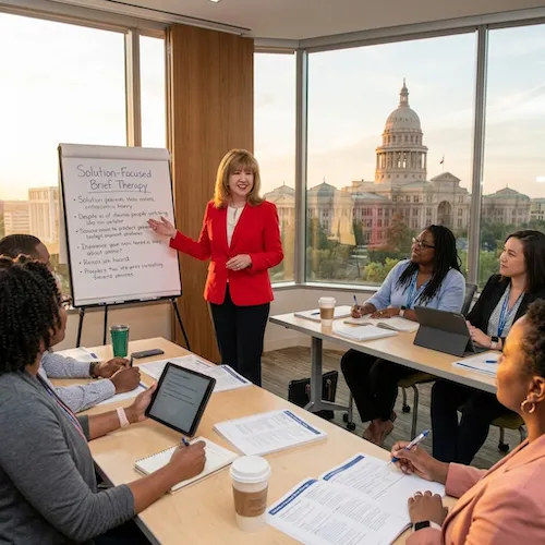 The program consists of 4 intensive days in Austin (July 6-9, 2026) plus one online completion session (July 22). You'll master solution-focused foundations, practice with real scenarios, visit Garza High School to see the approach in action, and create your implementation plan. The experience includes expert coaching, live demonstrations, and personalized feedback from Dr. Linda Metcalf.